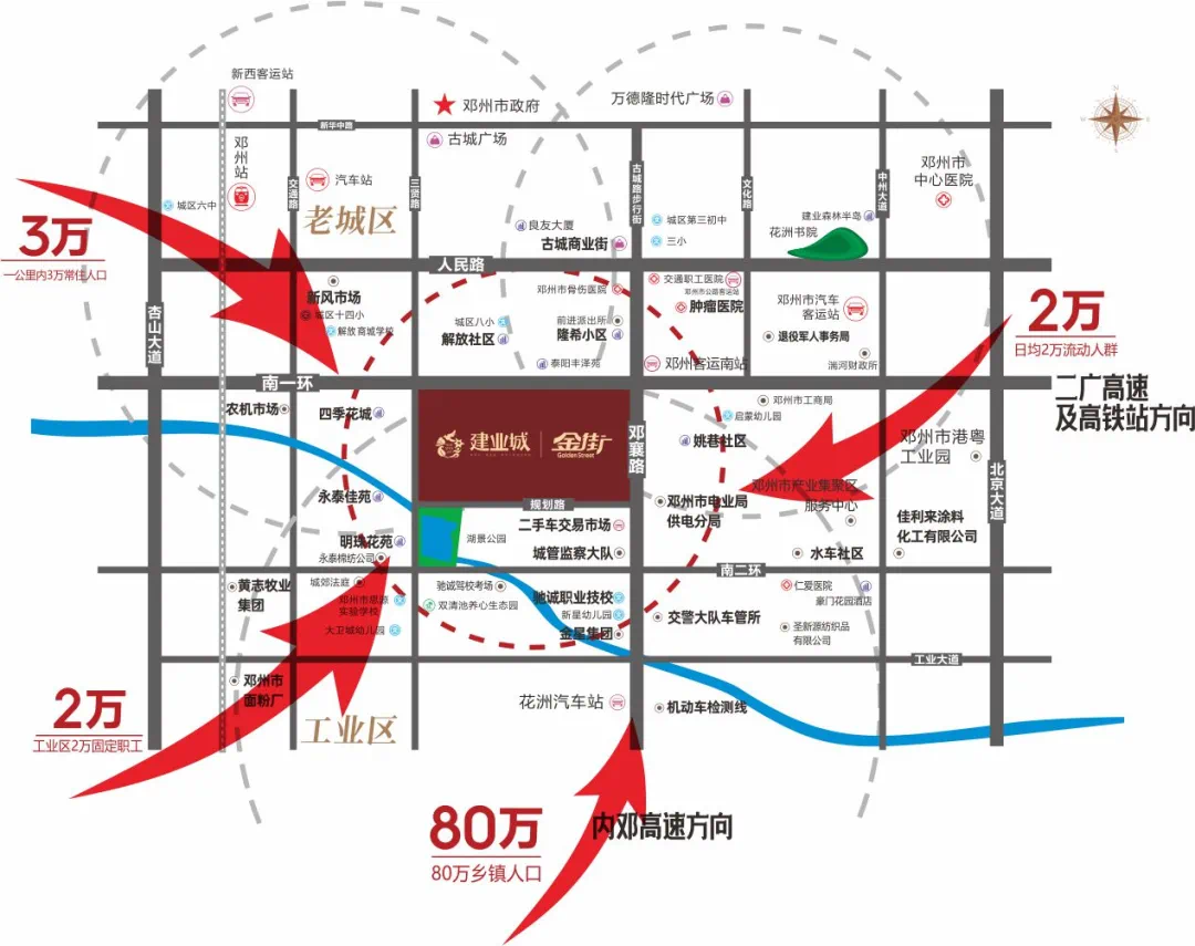 邓州建业城金街坐拥南城核芯住区,背靠丰泽苑、四季花城、永泰明珠等成熟小区和建业城数万业主;驰诚驾校、交警大队、机动车检测线、二手车交易市场、农机市场等车辆相关单位、市场集中于此;古城商业街、产业区紧邻,数万人潮环聚,强劲商圈辐射,一铺赢未来!