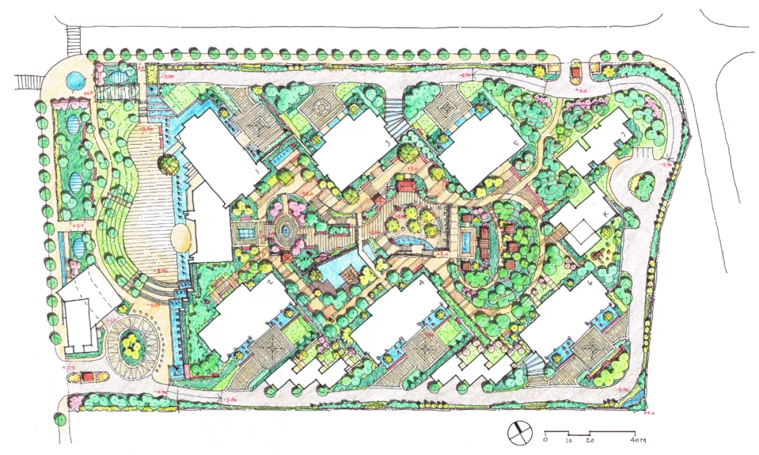 建筑用地与白河大道之间有50米市政绿地,并且与道路存在3米的自然高差,设计中充分利用了这些现状因素。利用场地高差设计了一个中心下沉空间,用于布局社区内大量的公共服务功能,为业主提供星级酒店标准的生活服务,打造少有的生活场景与体验。