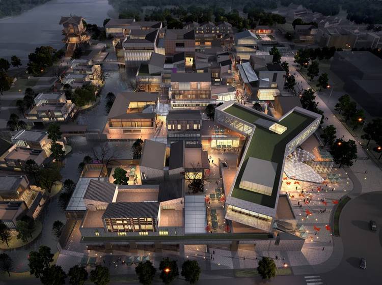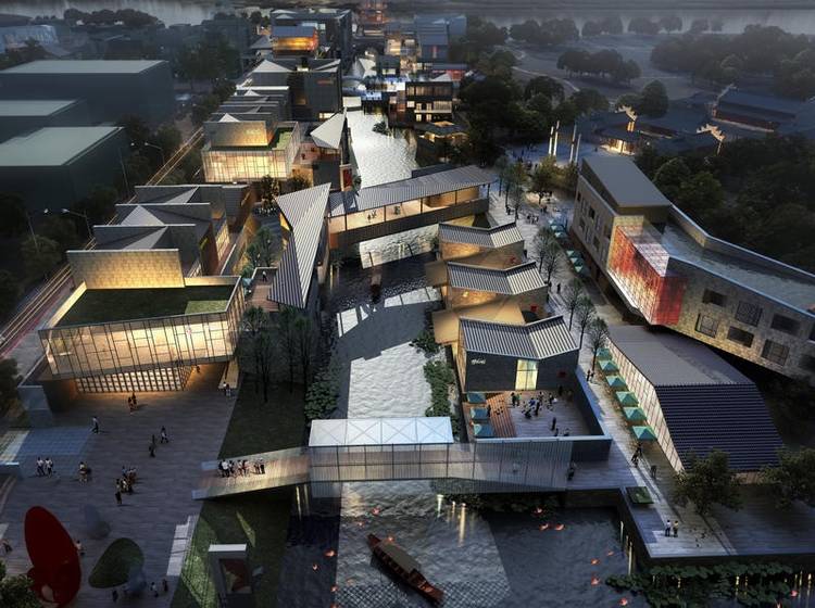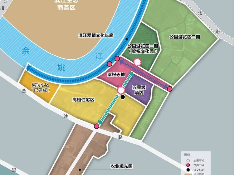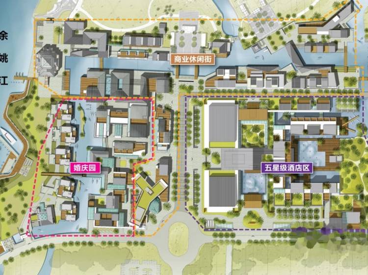 梁祝天地位于宁波梁祝文化产业园核心区,周边交通发达,轨道交通一号线在此设有“梁祝站”,城市主干道通途路、望春路(中山西路延伸段)紧邻项目,直达市中心,并规划多座桥梁横跨姚江,与北岸高端城市规划无缝对接。梁祝天地距宁波中心区、宁波栎社国际机场、高铁站、客运中心均约为15车程 梁祝天地位于梁祝文化产业园核心区域,紧邻梁祝文化园,是一个以梁祝故事为创作灵感,融合传统水乡肌理的现代中国风建筑群。不仅表达了 “新梁祝,真浪漫”的唯美意境,更创造了独特鲜活的商业体验。 梁祝天地周边高档社区林立,且多为近年新开发小区,区域规划以高档居住区为主;姚江对岸规划有宁波市奥体中心,江北行政中心,江北总部(商务)基地,江北创业投资园区等。目前,这些项目已经陆续开工建设,建成之后将成为宁波城市副中心之一。 梁祝天地由“商业休闲街”及“婚庆园”两大部分组成,旨在将传统民俗与时代风貌优质融合,打造一个以特色婚庆为主题,休闲、商务消费为核心,梁祝文化为背景;集特色餐饮、创意零售、精品酒店、婚庆产业、艺术活动为一体的“商、旅、文”主题街区 梁祝天地商业休闲街为婚庆园提供了购物、餐饮、娱乐等多种配套商业;而婚庆园为商业休闲街打造了浪漫的主题氛围,同时也为其带来宁波及周边地区的中高端消费人群。两者相辅相成,密不可分。 梁祝天地周边(5公里)高档小区居民约8万人(包括鄞州区的高桥镇、集仕港镇、海曙区的望春街道、白云街道、江北洪塘街道)。项目及周边中高端消费人群,行政公务员、企业总部商务人群、创业投资人群、滨江生态商务办公人群等,合计约10万人 梁祝天地的主入口也是游客接待中心,建筑主体采用一漂浮在空中的不规则几何体,其独具匠心的造型使得入口接待中心成为整个区域的标志物,同时结合景观照明的设计,营造出一种浪漫深远的意境。梁祝天地结合河道在不同标高上设置了多样化的景观休闲平台,曲折优美的景观岸线在优化了整个园区环境的同时丰富了游客的空间体验。 梁祝天地整体建筑立面造型以坡屋顶、石材肌理为主调,辅以木色材质及传统艺术符号,营造出了一种富有中国传统特色的现代商业建筑氛围