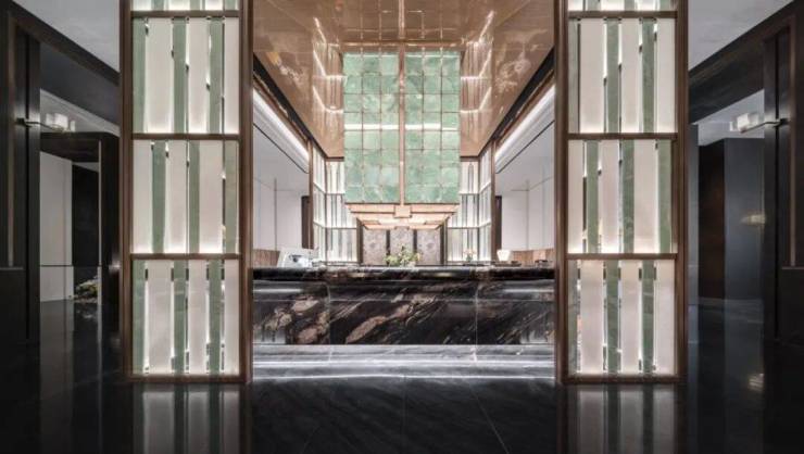 利用高差形成立体观景视野,以玉为心、以水为魂,叠瀑流水、松石相映,走进去像一幅立体山水画。