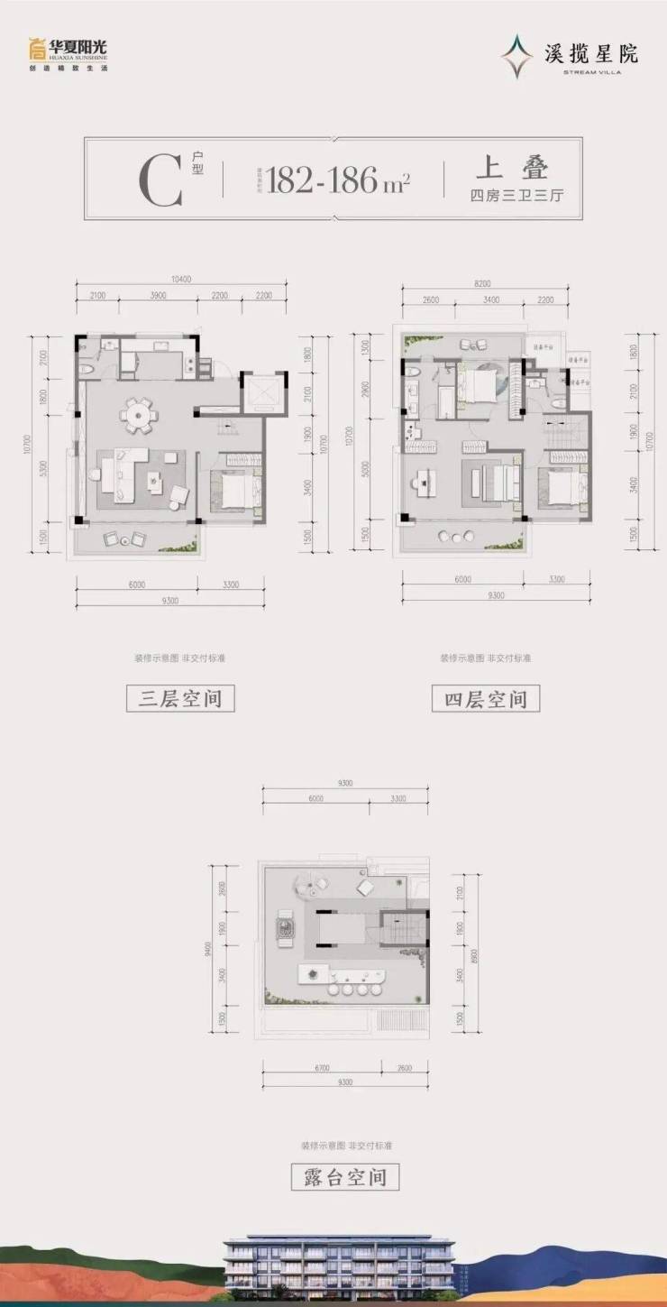 建面约182~186㎡上叠:约6m顶层观景阳台/餐客厅、书房开放设计/套房式主卧