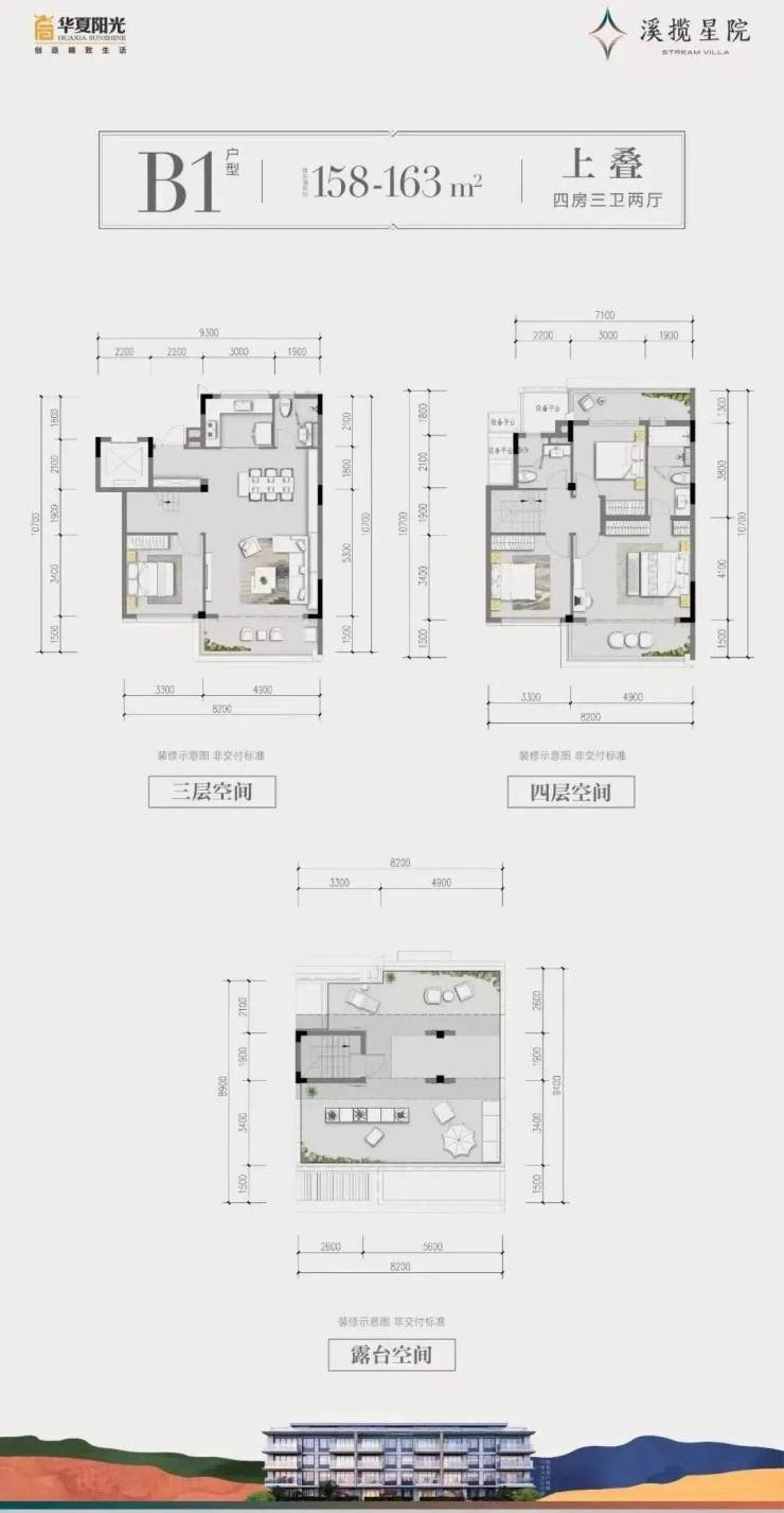 建面约158~163㎡上叠:顶层景观阳台/餐客一体连厅/套房式主卧/舒奢三卫设计