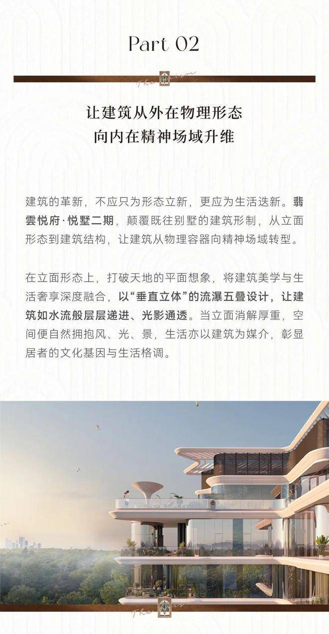 翡云悦府官方售楼处电话:400-8818-994【预约☎】在立面形态上,打破天地的平面想象,告别砖石的沉重,将建筑美学与生活奢享深度融合,以垂直立体的流瀑五叠设计,让建筑如水流般层层递进、光影通透。更难得的是,流瀑五叠并非只为视觉服务,更是为每一层创造不同的观景视角和光影体验,让每一户都拥有自己的那一抹天光。