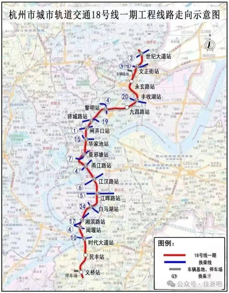 星桥站一站换乘18号线(世纪大道-义桥, 预计2028年通车)途经永玄路,丰收湖,笕桥,钱江新城,滨江白马湖等区域,实现城市繁华的无界联通。
