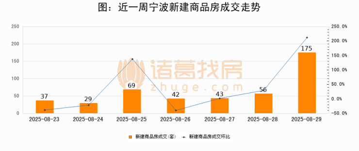 根据宁波市房产市场管理中心数据显示,2025年08月29日宁波新建商品房成交175套,较昨日增加119套,环比上涨212.5%。近一周宁波新建商品房日均成交65套。08月29日单日成交175套,高于近一周平均水平169.2%。