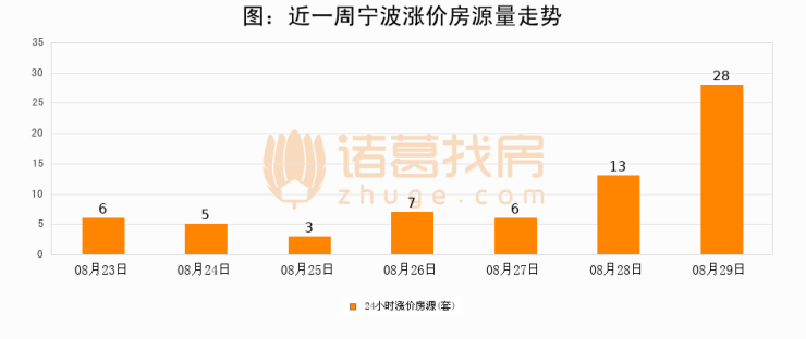 根据诸葛找房数据显示,宁波24小时涨价房源量为28套,较08月28日增加15套,环比上涨115.4%。与此同时,涨价房源占比小幅扩大,业主信心有所提升。