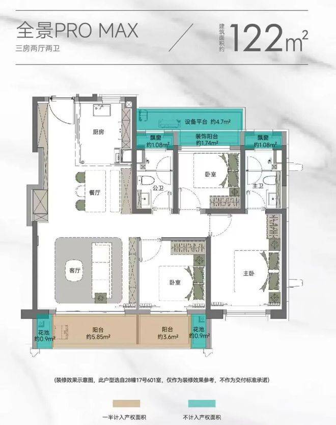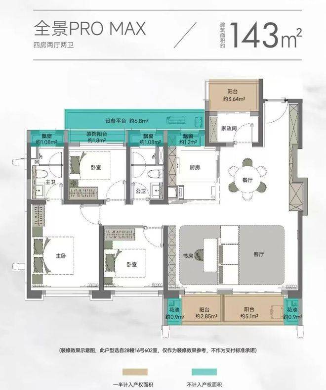 以105㎡的户型为例,“三阳台”搭配花池的设计,直接性价比拉满,按照规定:阳台计一半面积,花池不计面积,加上主卧+卫生间还带飘窗(主卧飘窗非承重结构),如此算下来,对购房者而言,日常可以实打实利用到的面积是远超市面上其他三房产品。