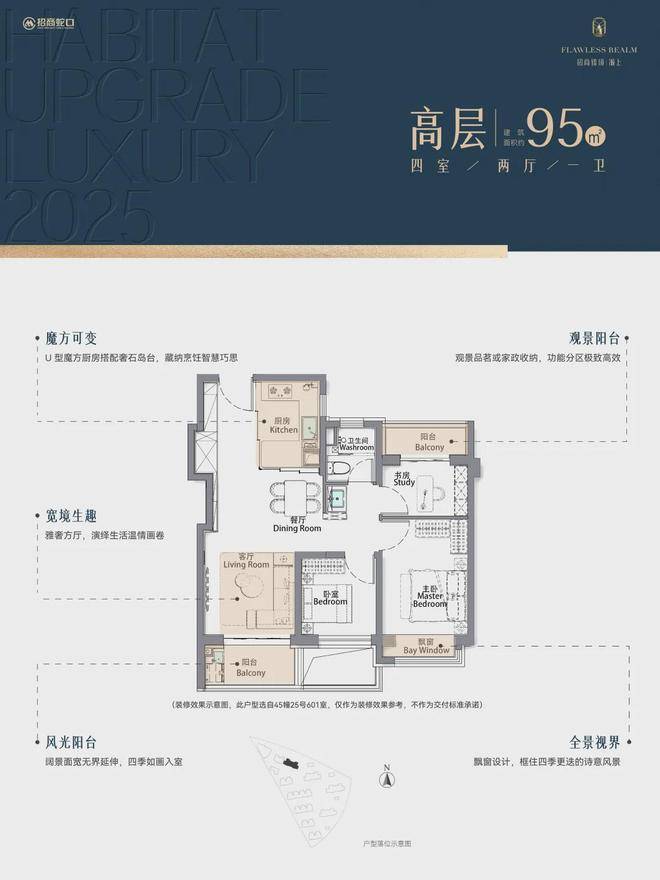 再加上南向大面宽短进深、全卧飘窗、L型转角阳台设计,哪怕小户型95㎡3房,尺度感都超棒,采光和视野更是一流。
