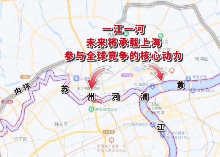 在静安、闸北合并之后,这片土地的城市更新速度加快,苏河湾板块在2016年的苏河湾十三五规划期间,将目标定位:“要重新拿回上海‘都市之心’的宝座”,在随后的“2035规划”中,苏河湾更是被布局为世界级中央活动区,未来将是城市封面的存在。苏州河站位“一江一河”规划,对于上海来说,未来苏州河沿岸应当是比黄浦江更适宜居住的存在。