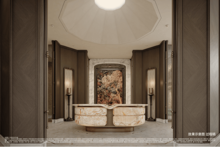 归家八角厅:以法式为底蕴,地面与墙面精选贝金米黄大理石与卡拉白大理石铺陈,纹理如山水画般自然流动。