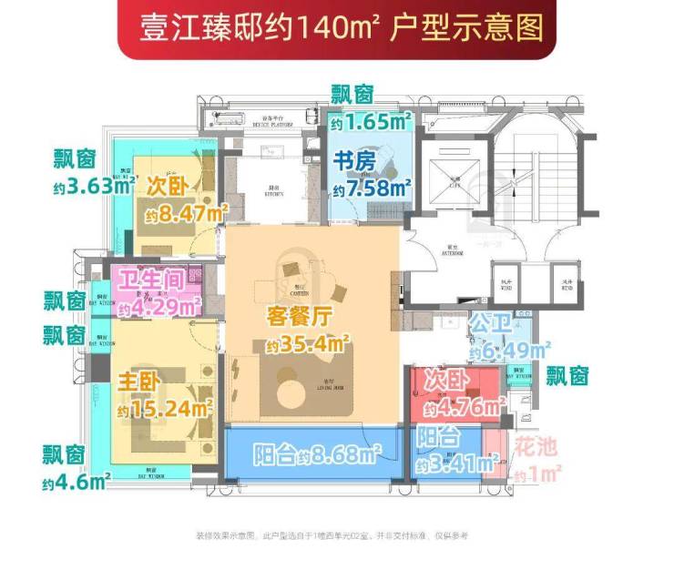 建面约140㎡户型则通过6个飘窗(含2个270°转角飘窗)、2个南向阳台(赠送一半面积)及独享约6.8㎡电梯厅,赠送面积高达约27.2㎡。
