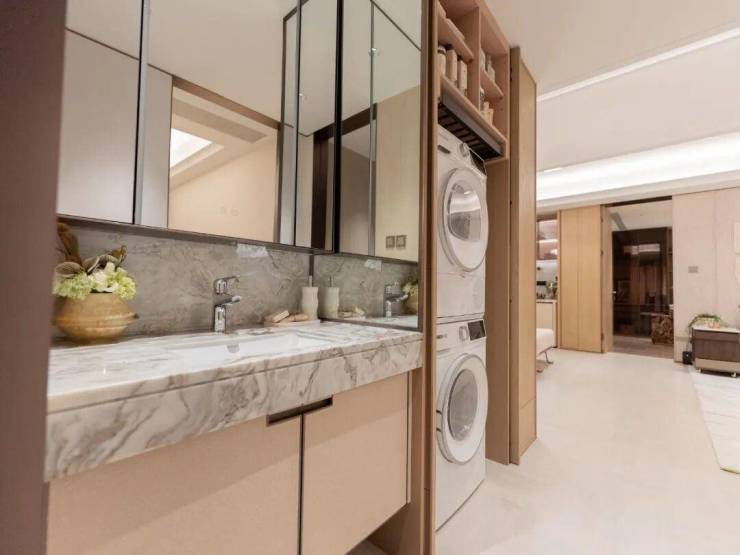 它整合了洗烘套件、分类收纳,将洗衣、烘干、收纳整理集中于一体。另外据说后期开发商可提供阳台改造隐形晾衣架服务,供业主自主选择烘干或晾晒。