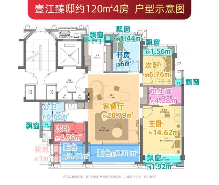 建面约120㎡户型通过6个飘窗、2个南向阳台(赠送一半面积)及独享约5㎡电梯厅,整体赠送面积约18.5㎡。
