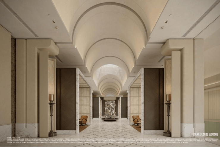 入口处悬挂量身定制的装置作品,以现代语言呼应新经典主义美学,从第一印象奠定社区艺境格调。