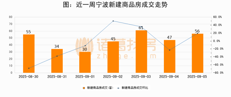 根据宁波市房产市场管理中心数据显示,2025年09月05日宁波新建商品房成交56套,较昨日增加9套,环比上涨19.1%。近一周宁波新建商品房日均成交47套。09月05日单日成交56套,高于近一周平均水平19.1%。