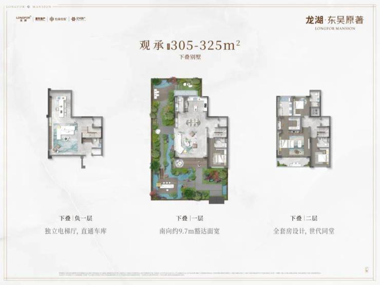产品力扎实:洋房宽景阳台、主卧套房设计;叠墅 / 联排私梯入户、庭院 / 露台赠送,联排 6.9 米地下挑高,满足改善 / 终极居住需求