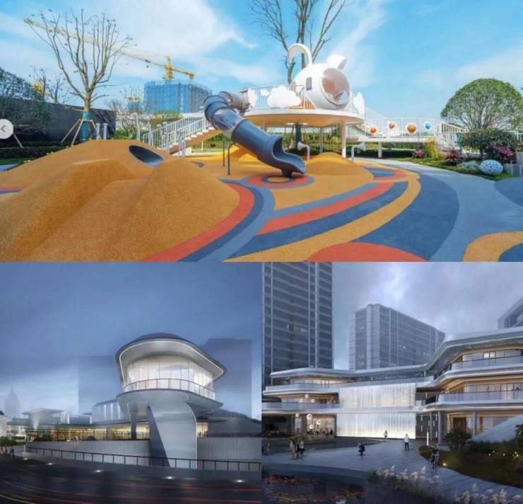 社区出入口多达5个,有的设计为星河主题的儿童游乐场,有的是自带IMAX水幕的“浮岛水岸聚场”。