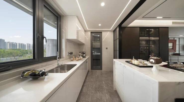 步入室内,超70㎡的社交生活主场,足以承载家庭欢聚、老友宴请等多元场景,是主人气度的最佳彰显;中西双厨的可变式灵活设计,兼顾了中式家宴的烟火气与西式烘焙的仪式感,独立家政阳台则一站式解决洗衣、晾晒、储物需求,让居家空间整洁有序。