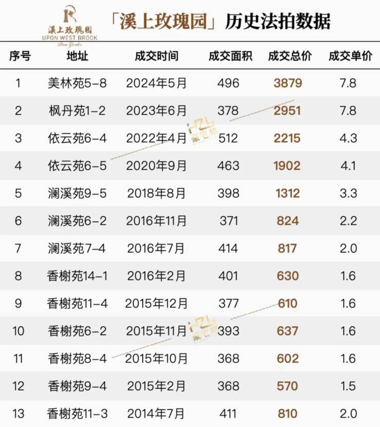 「溪上玫瑰园」近几年,年成交量都在3-4套左右,总价相对稳定,澜溪、香榭总价最低,普遍在2300-2800万之间,二三期以3000-4000万级为主力,美林苑报价基本在5000万以上。