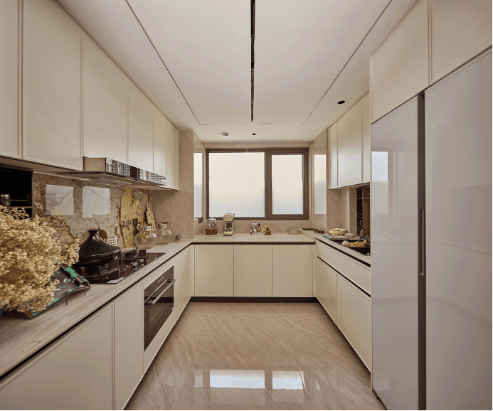 U 型厨房更创新采用上海首个高低台设计,既解决下厨弯腰痛点,三面台均分还能拓展操作空间。