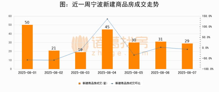 根据宁波市房产市场管理中心数据显示,2025年08月07日宁波新建商品房成交29套,较昨日减少2套,环比下降6.5%。近一周宁波新建商品房日均成交33套。08月07日单日成交29套,低于近一周平均水平12.1%。