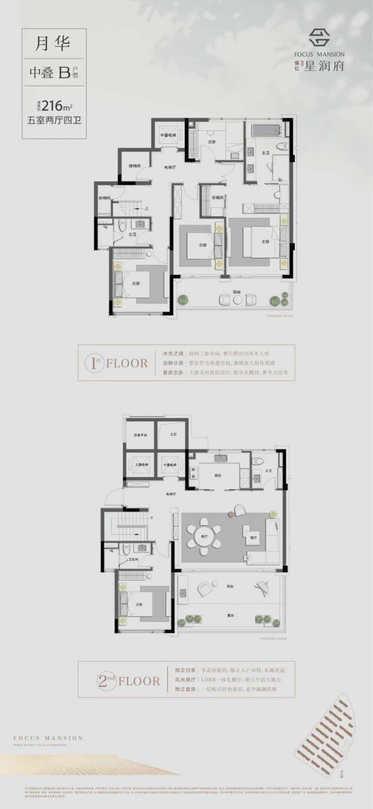 精装改善户型:户户私梯入户、独门独院;下叠花园、上叠露台、中叠私享,地下室约 5.8 米挑高(可做酒窖 / 影厅 / 私宴厅)