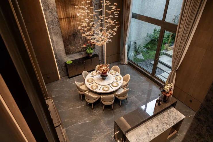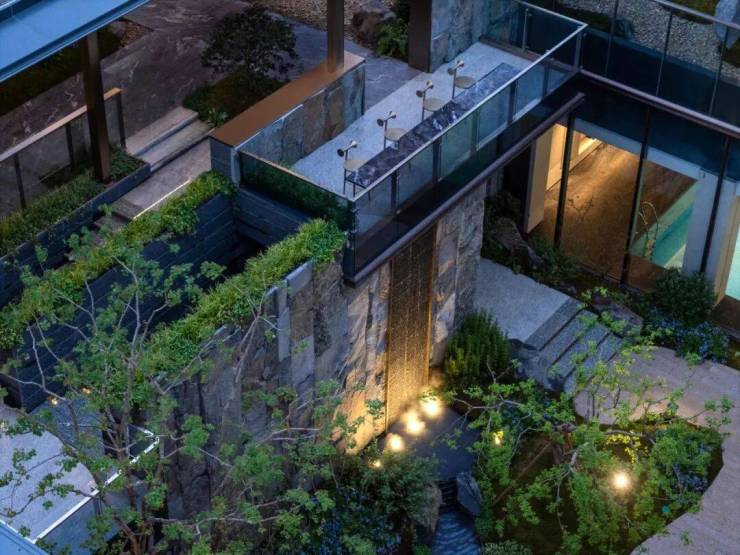 里面点缀着特选黑松、羽毛枫、4棵乌桕等,以及采用约40吨自然石皮面打造的垂直立面墙,整个庭院犹如立体山水画卷,每一个角度都有不一样的风景。