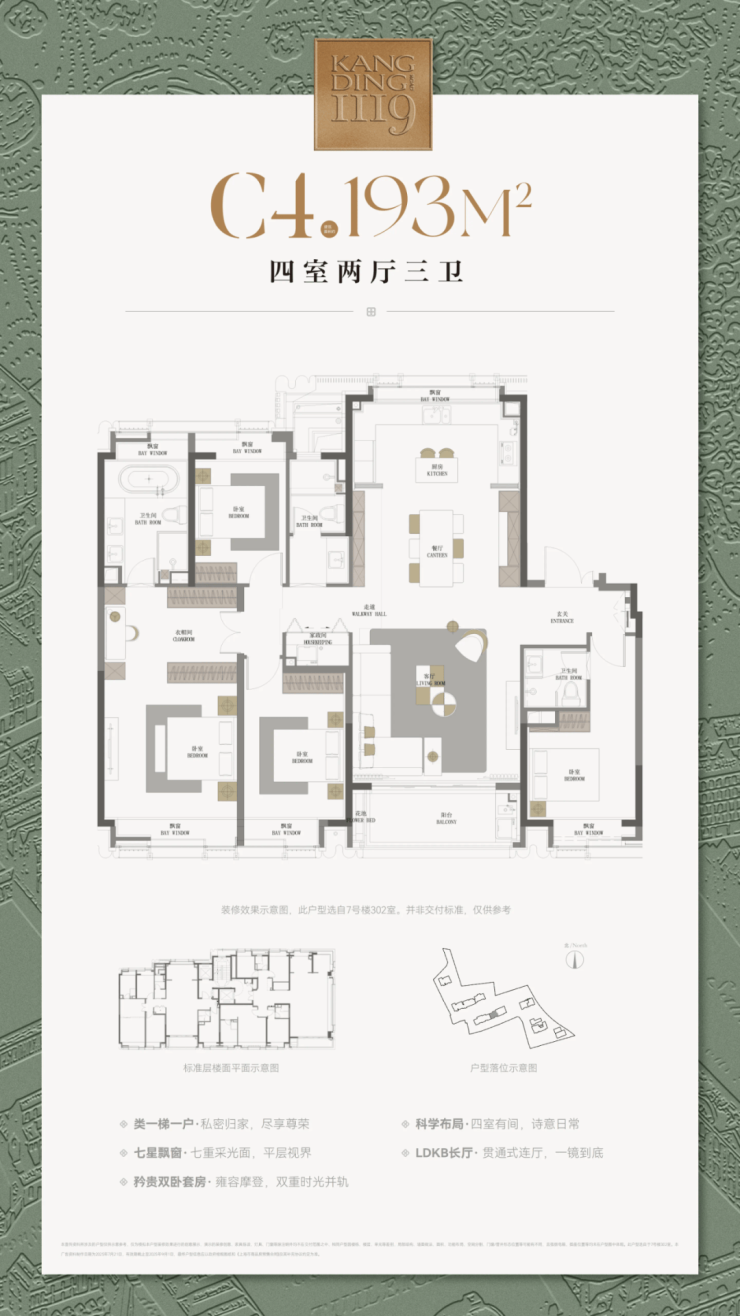 以建面约193户型为例,卫浴设备采用国际品牌如唯宝、高仪、卡德维等,厨电品牌采用嘉格纳,全套配置油烟机、灶台、洗碗机、双开门冰箱、蒸烤一体机等,同时装配德国美诺洗衣机烘干机套装。