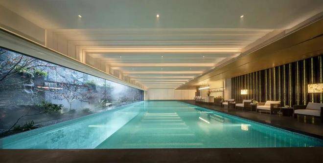 古驰黑奢石与非遗琉璃共筑的背景墙,映照着窗外由天然岩皮与奢石砌成的三级瀑布。羽毛枫在岸边隔窗静立,泳池全地暖设计,恒温脉冲水流轻抚肌肤,并于岸边打造镜湖春晓奢石搭配贝壳艺术背景墙设计的酒店式水吧台休憩区,布置全套安缦御用的HARBOUR户外家居【溪谷泳池】游弋其中,是一次对自然与艺术的全身心沉浸