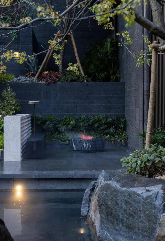 而在3、5号楼之间,则搭建了【围炉夜话】场景空间。古木纹奢石砌成的火炉旁,整木炭化石凳散发着山林野趣,一株红舞姬枫树翩然伴舞。冬日傍晚,好友围坐,体会名门温情。