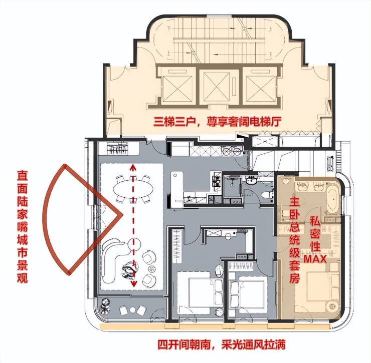 约8.6米的北向大横厅,衔接两间卧室,形成总面宽超10米的震撼瞰江界面,江景在这个户型,不再是窗边的点缀,而是扑面而来的华丽画卷。