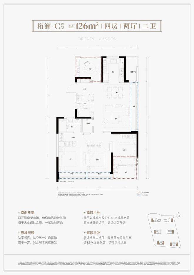 建面约126方4房2卫,270°稀缺边套四房