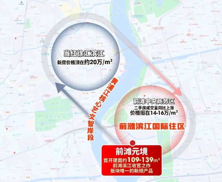 项目牢牢锚定前滩核心,与前滩商务区深度联动,同时直线距滨江仅约300米,兼具核心地段与滨江资源。