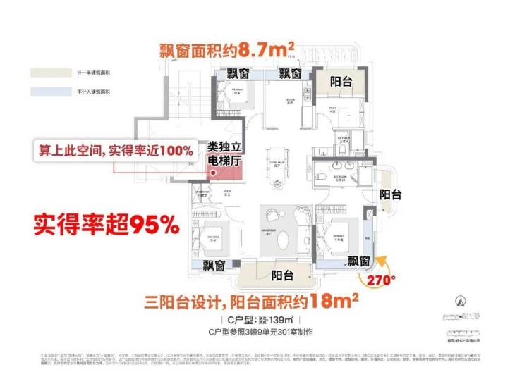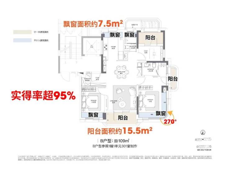 户型设计上,多阳台+一步飘窗(部分边套)+应飘尽飘,实得率超95%。