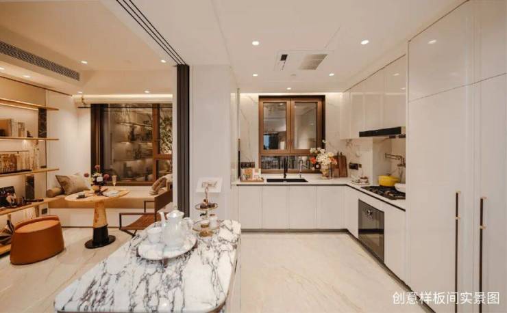 同时厨房尺度开阔,客餐厨一体化空间通透大气,契合结构简单的家庭对阔绰公共空间的需求。