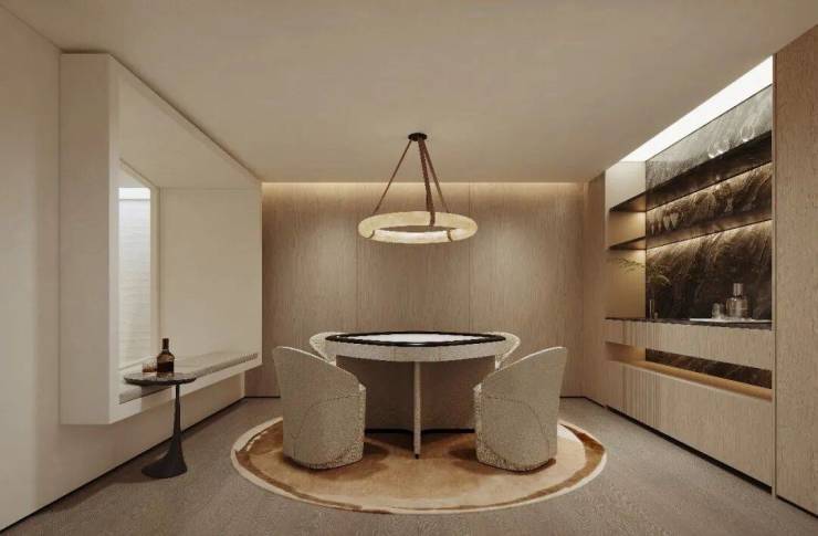 却又通过材质的微妙变化悄然分区——木饰面的温润、石材的冷冽、布艺的柔软,在同一色调下和谐共生。