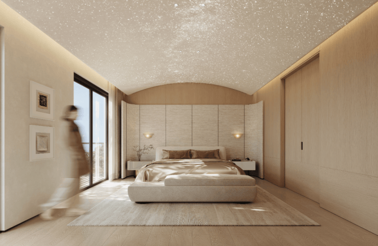 隐藏式灯带勾勒空间轮廓,壁灯、吊灯如星光洒落,夜晚降临时,
