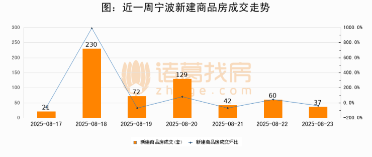 根据宁波市房产市场管理中心数据显示,2025年08月23日宁波新建商品房成交37套,较昨日减少23套,环比下降38.3%。近一周宁波新建商品房日均成交85套。08月23日单日成交37套,低于近一周平均水平56.5%。
