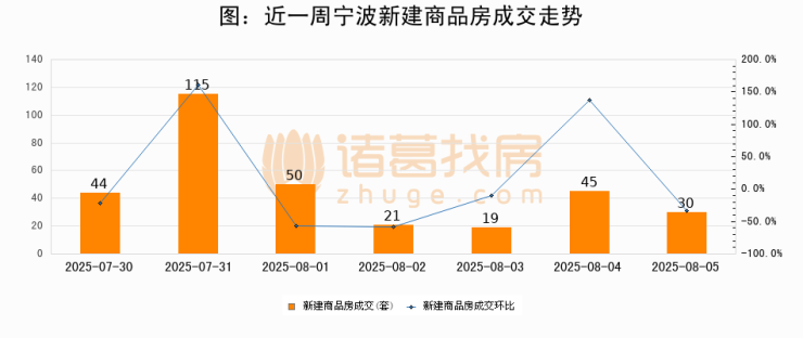 根据宁波市房产市场管理中心数据显示,2025年08月05日宁波新建商品房成交30套,较昨日减少15套,环比下降33.3%。近一周宁波新建商品房日均成交47套。08月05日单日成交30套,低于近一周平均水平36.2%。