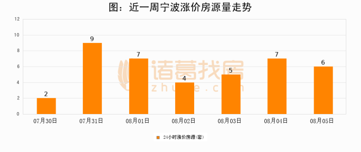 根据诸葛找房数据显示,宁波24小时涨价房源量为6套,较08月04日减少1套,环比下降14.3%。与此同时,涨价房源占比小幅回落,对于购房者来说是一个入市窗口期,购房者可抓住时机入市。