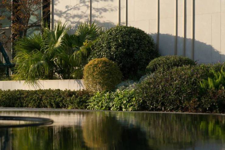 △ 景墙开口涌泉,经过黑山石落于涌泉下形成跌水,两侧自然与规整的植物有序搭配,收放中,丰富层次与视觉