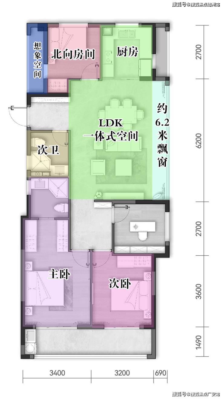 四房两厅两卫, 三个卧室均朝南,面宽近10米 ,以一个南向阳台和两个大飘窗的开阔尺度,构成生活更多的“向阳面”,舒适感UP!