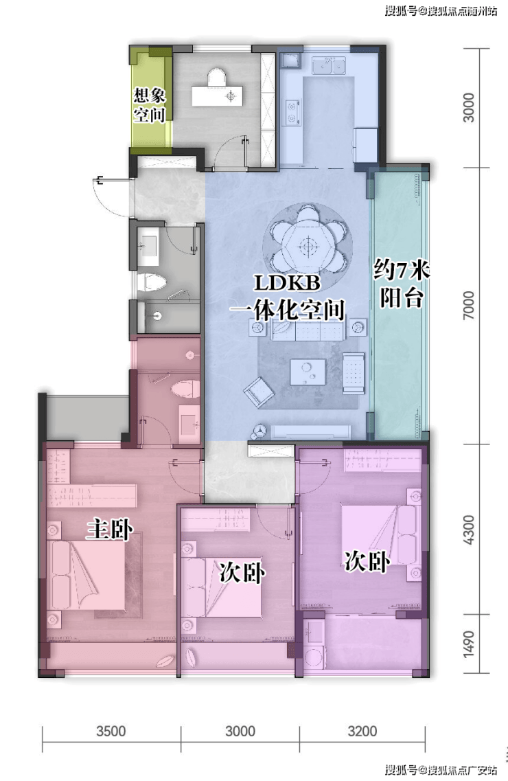 LDKB一体化设计,东面连接约7米阔绰阳台 ,空间足够宽敞,轻松容纳家庭聚会、亲子交流、萌宠互动等多重场景,还拥有了更好的采光通风,站在阳台欣赏四时风景,视野更加开阔。