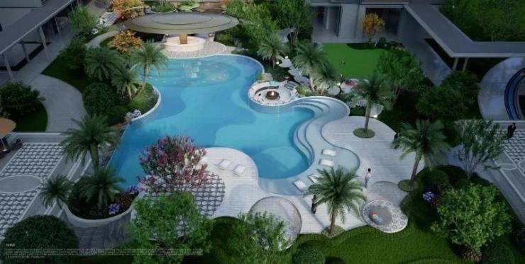 穿门而入,迎宾水院的风景很美,曲径通幽,步移景异。更亮眼的还有 异形“蓝宝石”戏水池 。