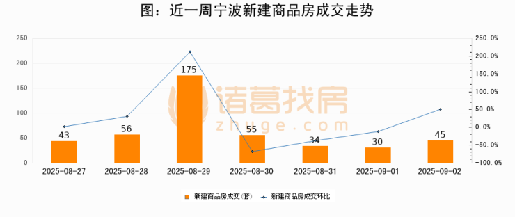 根据宁波市房产市场管理中心数据显示,2025年09月02日宁波新建商品房成交45套,较昨日增加15套,环比上涨50%。近一周宁波新建商品房日均成交63套。09月02日单日成交45套,低于近一周平均水平28.6%。