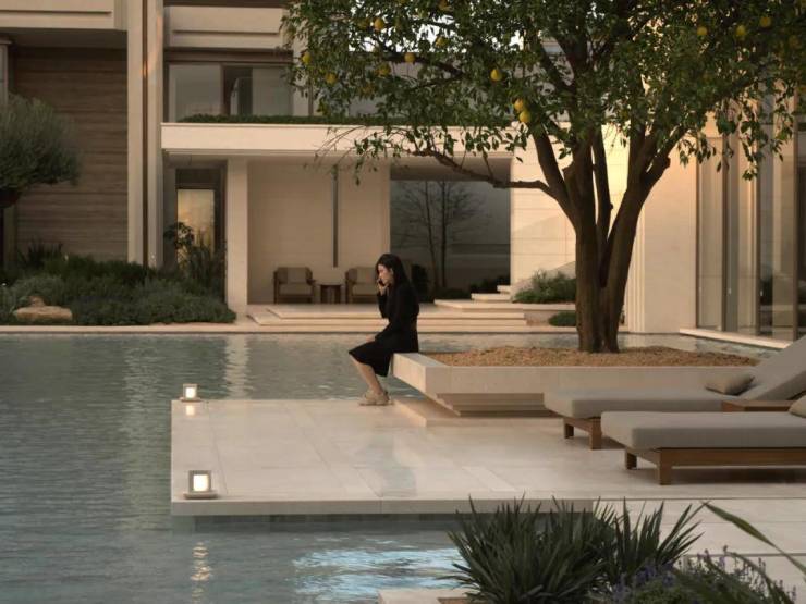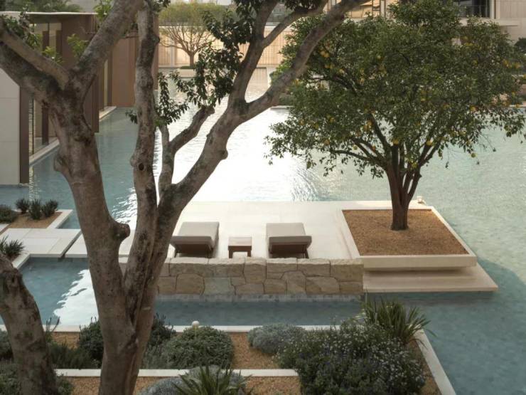 作为首个度假风情的住区,璟逸汲取希腊安缦酒店与Gundari度假村的精髓。素雅的米白石壁墙引领访客,穿行于水院与连廊之间,步入白色莱姆石建筑群,冰蓝水面与沙生植物交织的闲适景致,仿佛将圣托里尼的暖阳拥入怀中。