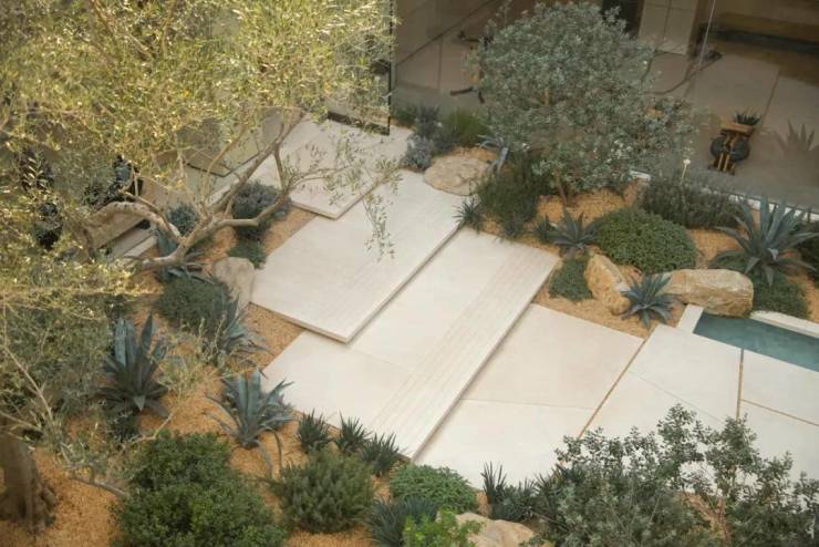 漂浮的海角花园自由延展,砾石花园与林台错落交融,树影与水光相映成趣。米白墙垣与古铜铝板的肌理在光影中呼吸,植物舒展的枝桠以舞蹈的姿态定格成永恒油画。