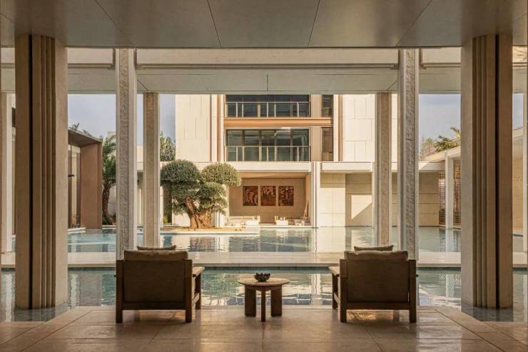 步入二进橄影廊庭,光影在回廊与水面间流转,构成静谧而富有呼吸感的水庭。天光倾泻,水色生辉,如同希腊安缦花园般悠然浪漫,演绎栖居的诗意序章。
