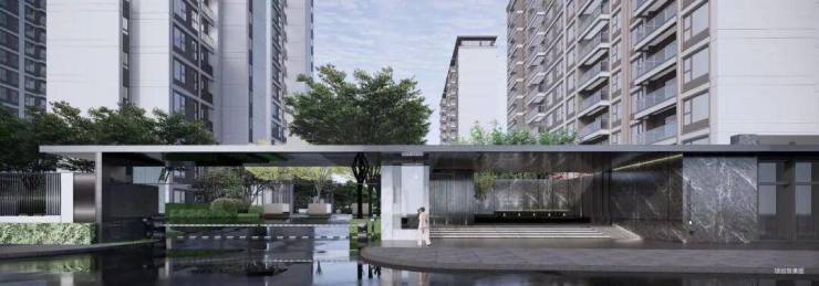公建化高颜值立面:铝板 + 真石漆 + 大面积玻璃幕墙,现代简约质感,板块颜值标杆