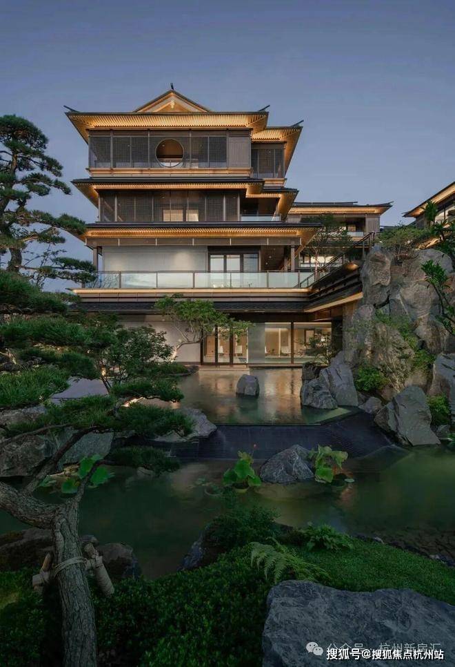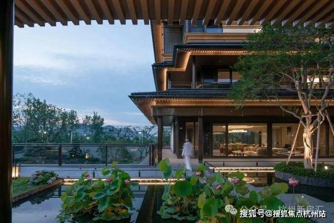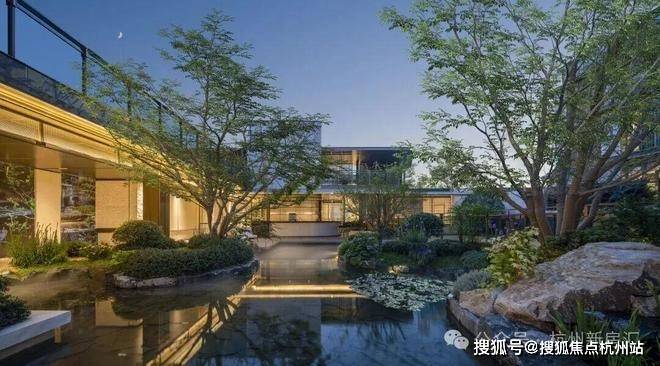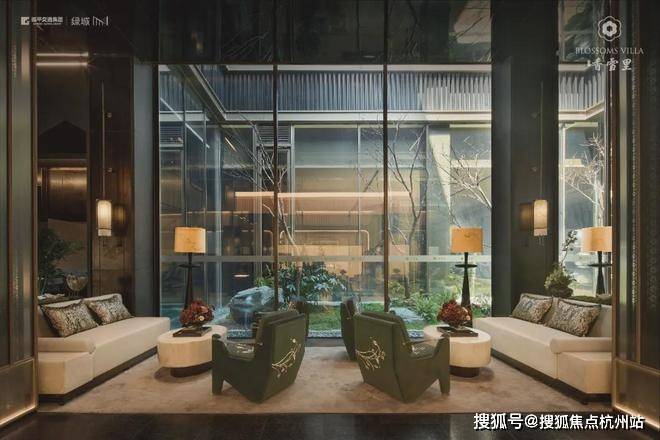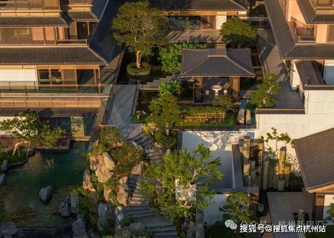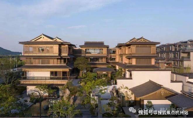 建筑立面:古今交融的诗意表达:外立面以香槟金铝板为基调,搭配蓝眼睛石材与玻璃幕墙,融合传统歇山重檐、纳福悬鱼等元素,既保留宋式建筑的对称美学,又赋予现代建筑的轻盈通透。合院组团采用三面庭院设计,L型景观面与环绕式檐廊,将超山梅影、丁山湖光引入每一扇窗景!